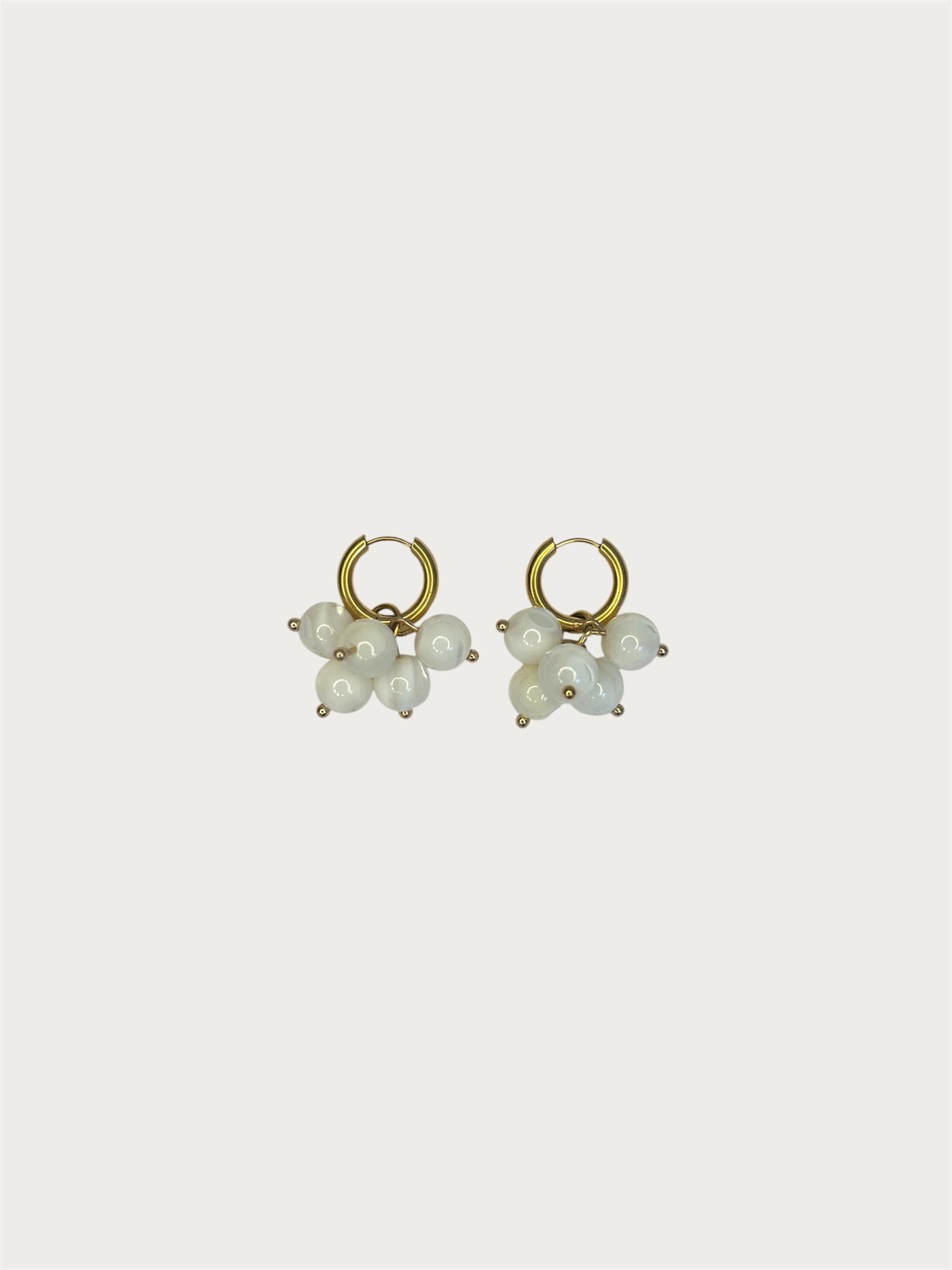Boucles d'oreilles créoles en acier inoxydable sur lesquelles sont accrochés des pierres naturelles nacrées.