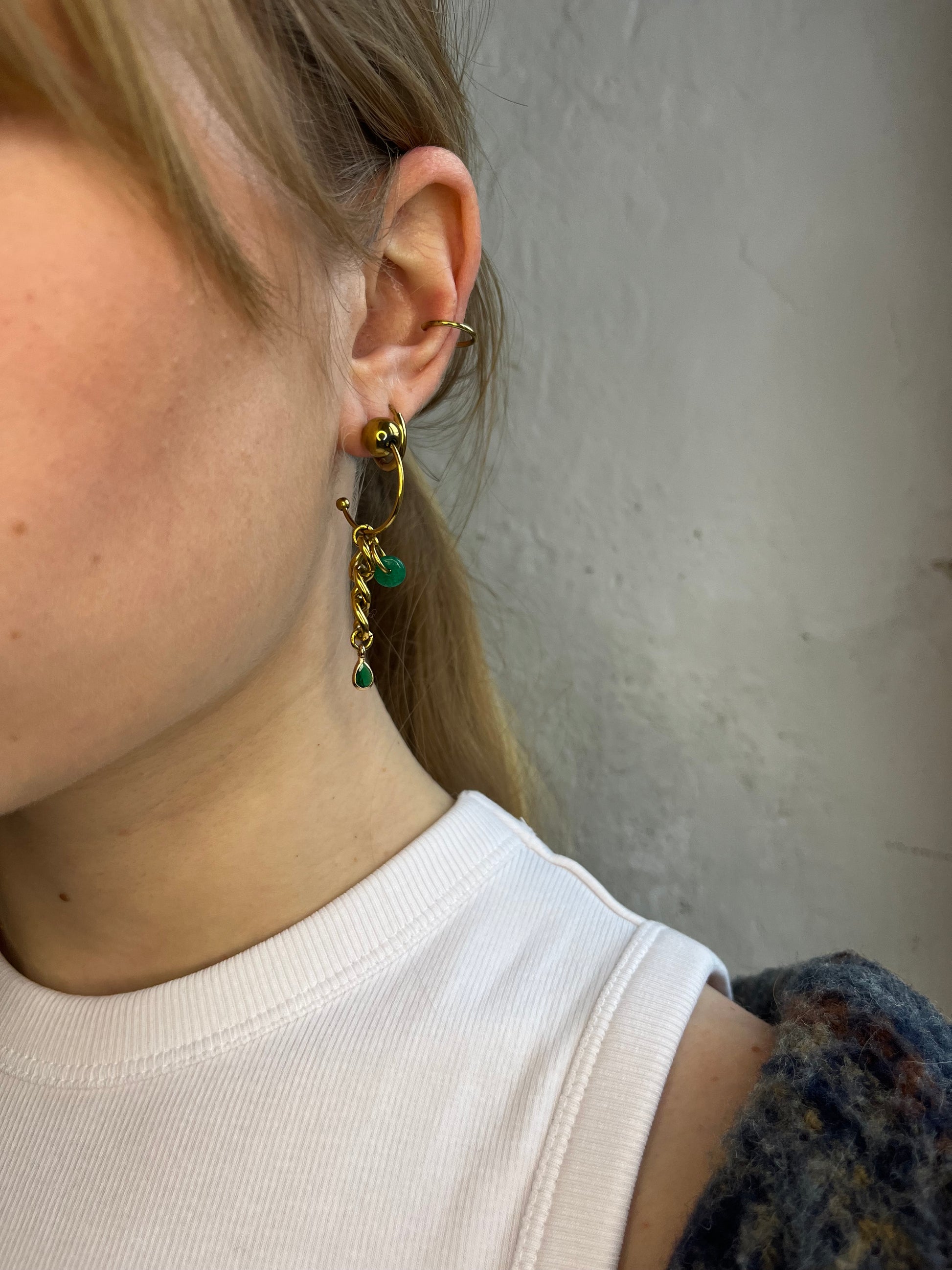 Boucles d'oreilles composé de perles hématite, chaîne gourmette et strass vert